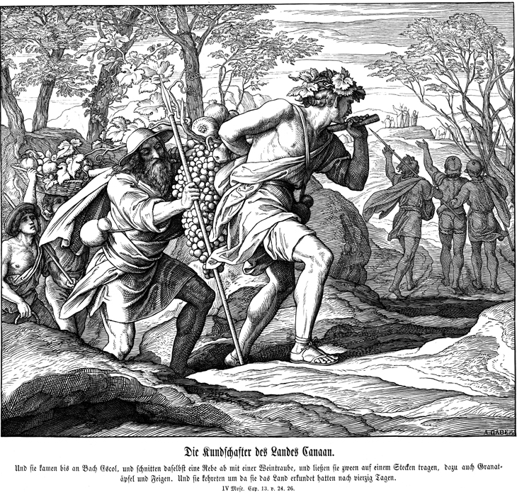 Description: Julius Schnorr von Carolsfeld's (1794-1872) depiction of Joshua and Caleb carrying a bundle of grapes as the expedition to the Promised Land returns.
