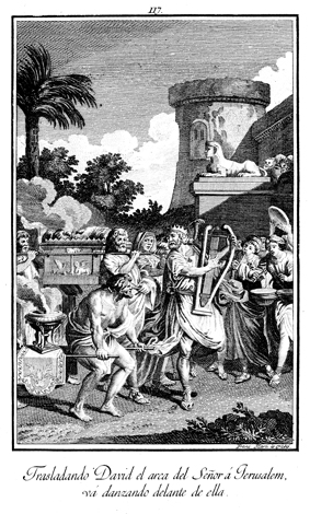 Description: David brings the Ark of the Covenant to Jerusalem with music and celebration. The engraver’s name is located at the lower right corner.