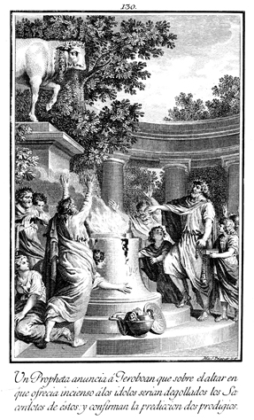 Description: The man of God speaks against the altar at Bethel, while King Jeroboam I is worshipping. Jeroboam orders the prophet’s arrest, but his hand shrivels up and the altar is split in half, testifying to God’s power. The engraver’s name is located at the lower right corner.