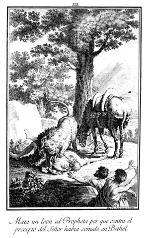 Description: The man of God is killed by a lion for failing to obey God's command. The engraver’s name is located at the lower right corner.
