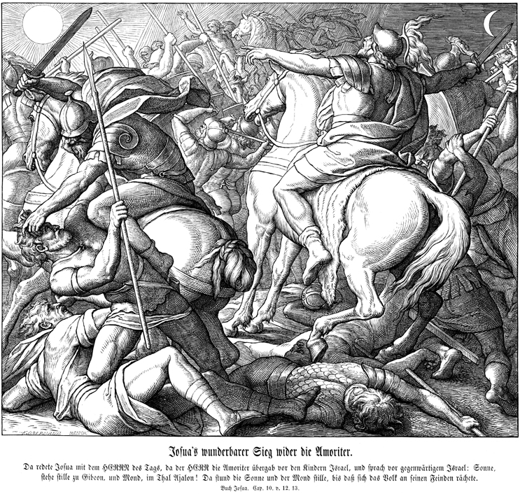 Description: Julius Schnorr von Carolsfeld's (1794-1872) depiction of the defeat of the Amorites by Joshua and the Israelites as the sun stands still.