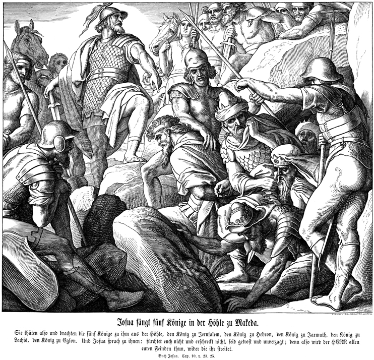 Description: Julius Schnorr von Carolsfeld's (1794-1872) depiction of Joshua capturing the Amorite kings of Jerusalem, Hebron, Jarmuth, Lachish, and Eglon in battle.