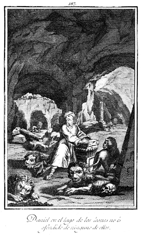 Description: Daniel is shown in the lions' den. The engraver’s name is located at the lower right corner. As the numeral at the head of the page indicates, this is plate #187 in a series of illustrations.