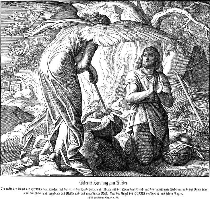Description: Julius Schnorr von Carolsfeld's (1794-1872) depiction of an angel of God igniting Gideon's sacrifice with his staff during his commissioning.