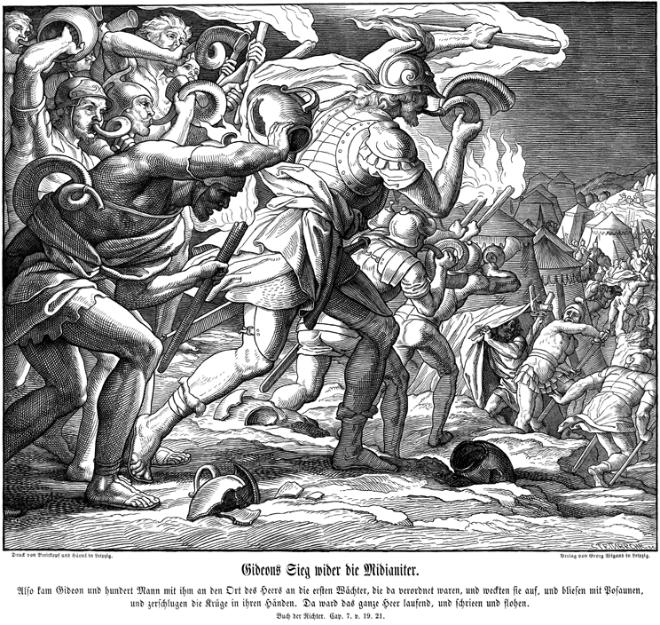 Description: Julius Schnorr von Carolsfeld's (1794-1872) depiction of Gideon and his army attacking the Midianite camp at night.