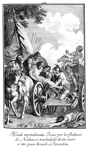 Description: King Josiah, who is mortally wounded by the archers of Pharaoh Necho, is moved from his chariot to a cart to be taken back to Jerusalem. The engraver’s name is located at the lower right corner.