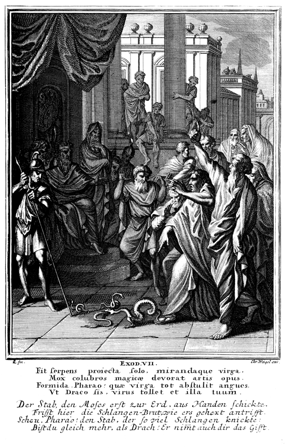 Description: Moses and Aaron appear before Pharaoh and turn Aaron’s staff into a serpent. This serpent then swallows the serpents created from the staffs of Pharaoh’s magicians.