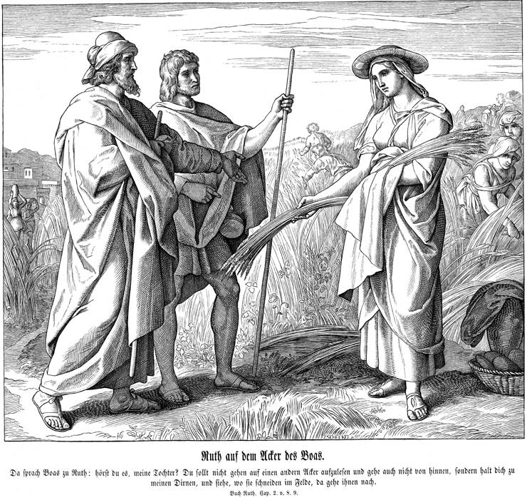 Description: Julius Schnorr von Carolsfeld's (1794-1872) depiction of Boaz meeting Ruth as she gleans wheat in his field.