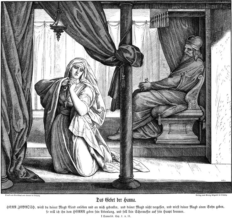 Description: Julius Schnorr von Carolsfeld's (1794-1872) depiction of Hannah praying for a child in the temple as Eli looks on.
