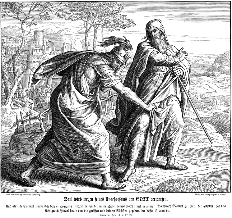 Description: Julius Schnorr von Carolsfeld's (1794-1872) depiction of Saul tearing a corner from Samuel's garment as Samuel turns to leave after proclaiming God's rejection of Saul; Samuel declares that the kingdom will be torn from Saul in the same fashion as the garment was torn.