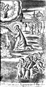 Description: Jesus prays in the garden of Gethsemane, while the disciples sleep (bottom right) and Judas leads the guards to arrest Jesus.