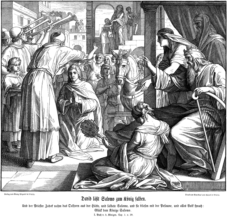 Description: Julius Schnorr von Carolsfeld's (1794-1872) depiction of the priest, Zadok, anointing Solomon, King of Israel, in the presence of King David and the people of Israel.