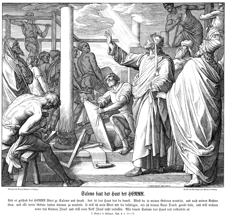 Description: Julius Schnorr von Carolsfeld's (1794-1872) depiction of Solomon giving instruction for the construction of the temple as he receives inspiration from heaven.