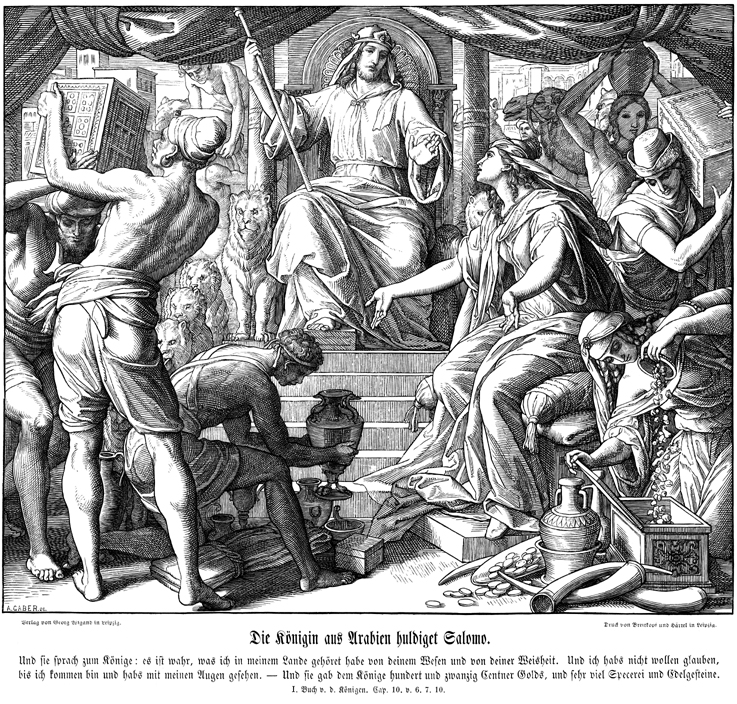 Description: Julius Schnorr von Carolsfeld's (1794-1872) depiction of the Queen of Sheba visiting King Solomon in Jerusalem.