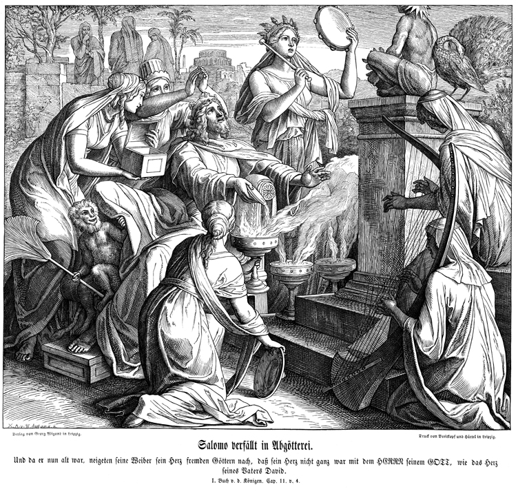 Description: Julius Schnorr von Carolsfeld's (1794-1872) depiction of King Solomon worshiping an idol at the urging of his wives.