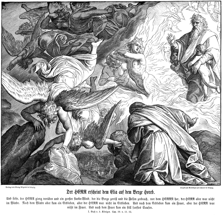 Description: Julius Schnorr von Carolsfeld's (1794-1872) depiction of God appearing to Elijah at Horeb theophany.