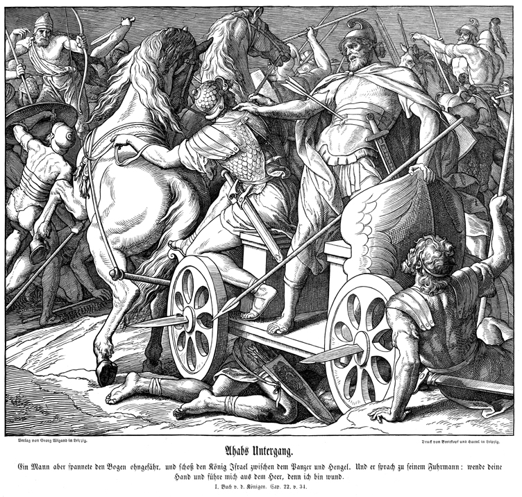 Description: Julius Schnorr von Carolsfeld's (1794-1872) depiction of a Syrian archer slaying Ahab, King of Israel, in the battle at Ramoth Gilead.