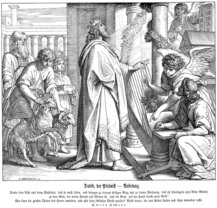 Description: Julius Schnorr von Carolsfeld's (1794-1872) depiction of David as the Psalmist; David with harp in hand receives inspiration from heaven as an angel directs a scribe and a priest stand with sacrificial rams.