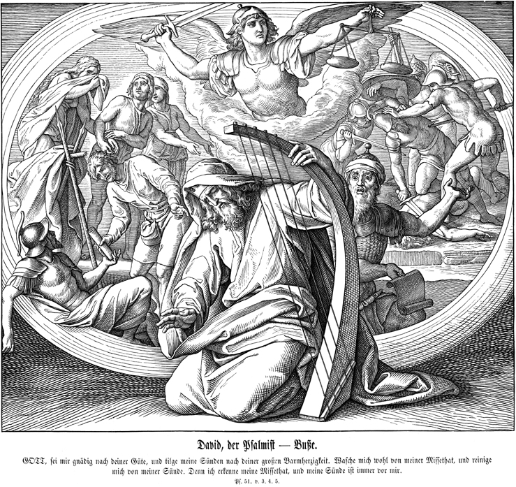 Description: Julius Schnorr von Carolsfeld's (1794-1872) depiction of David as the Psalmist kneeling in mourning and confession for his sins; in the background Bathsheba weeps as Uriah the Hittite delivers his own death notice and is murdered.