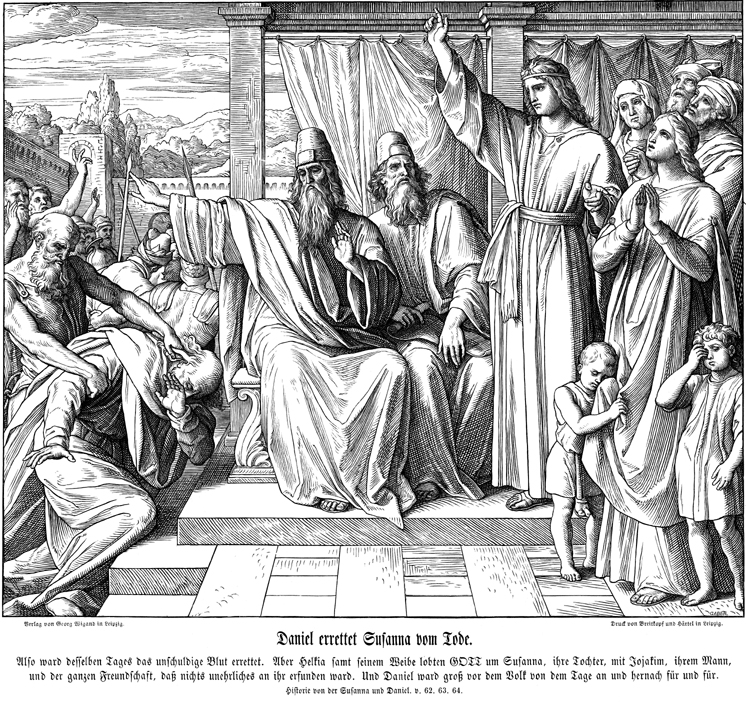 Description: Julius Schnorr von Carolsfeld's (1794-1872) depiction of Daniel vindicating Susanna by discerning the false witness of the elders.