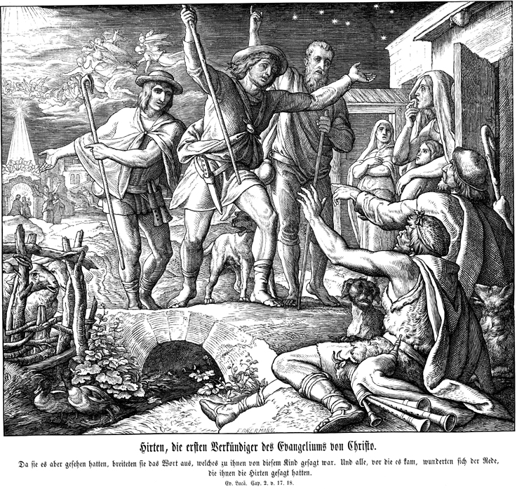 Description: Julius Schnorr von Carolsfeld's (1794-1872) depiction of the shepherds spreading the good news about the birth of the messiah, after seeing the baby Jesus in Bethlehem.