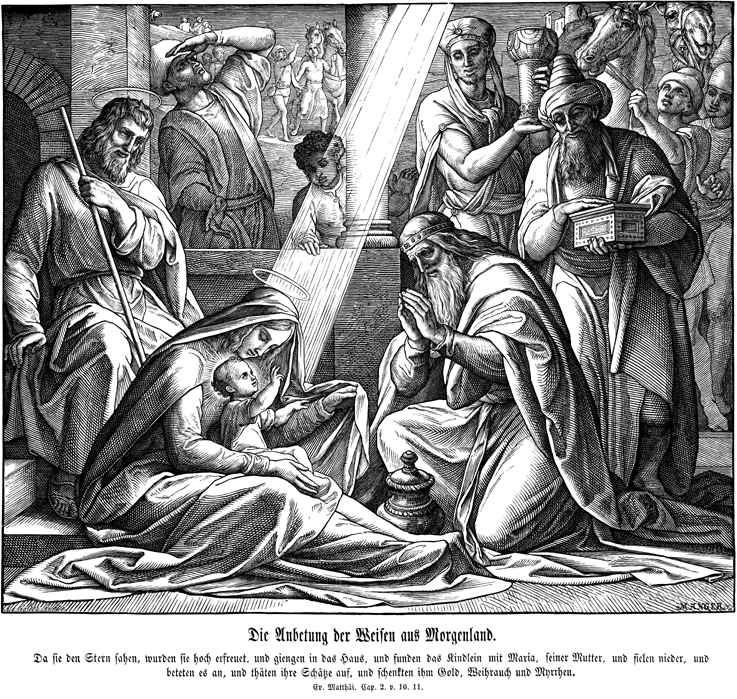 Description: Julius Schnorr von Carolsfeld's (1794-1872) depiction of the magi bringing the baby Jesus gifts of gold, frankincense, and myrrh.