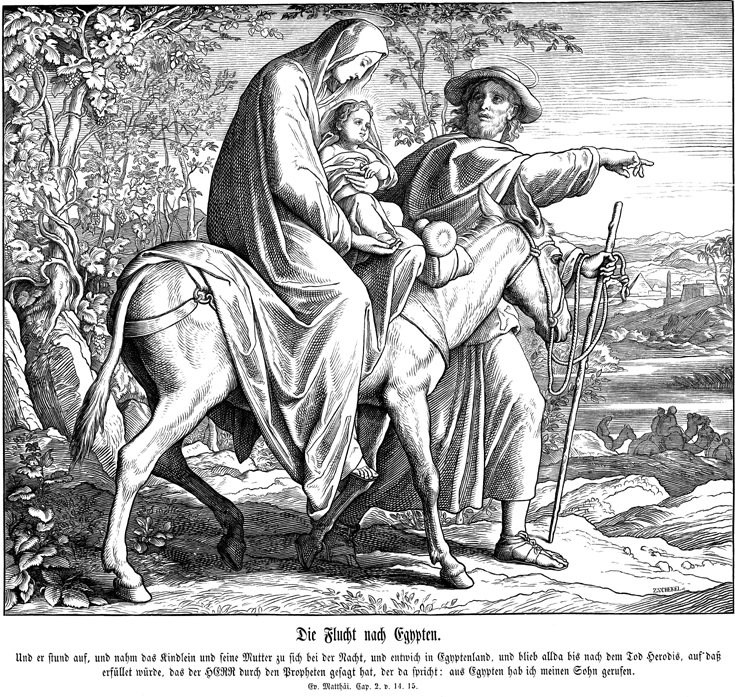Description: Julius Schnorr von Carolsfeld's (1794-1872) depiction of Mary, Joseph and baby Jesus fleeing to Egypt.