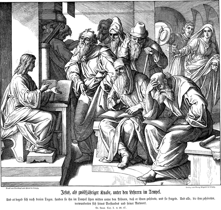 Description: Julius Schnorr von Carolsfeld's (1794-1872) depiction of Mary and Joseph finding the twelve-year-old Jesus in the temple, where he is sitting among the teachers, listening and asking questions.