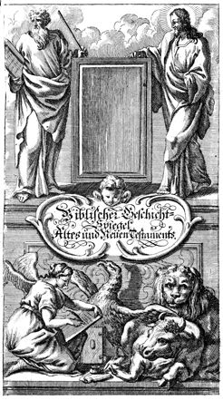 Description: Moses and Jesus are positioned at the top of the page, and the symbols of the four Gospels below: an angel (Matthew), eagle (John), an ox (Luke), and a lion (Mark).
