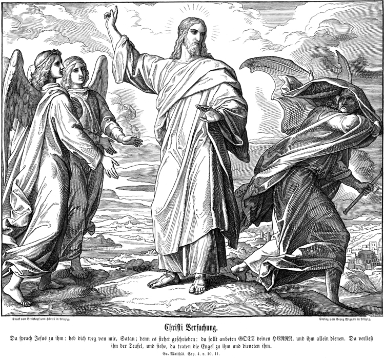 Description: Julius Schnorr von Carolsfeld's (1794-1872) depiction of the devil resigning from tempting Jesus as angels attend to him.