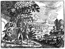 Description: An angel holding a flaming sword banishes Adam and Eve from Eden, sending them out into the larger world.