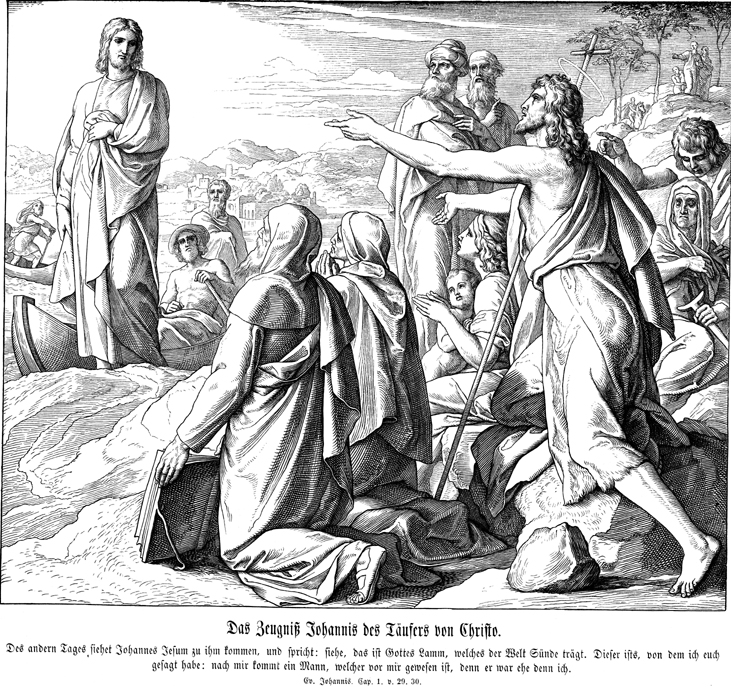 Description: Julius Schnorr von Carolsfeld's (1794-1872) depiction of John the Baptist pointing out Jesus to his disciples.
