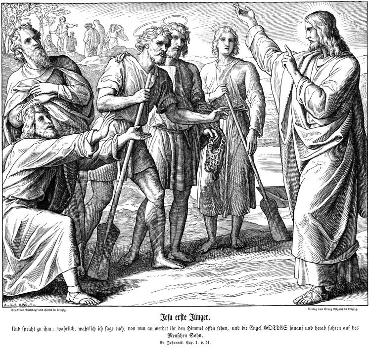 Description: Julius Schnorr von Carolsfeld's (1794-1872) depiction of Jesus calls his first disciples as John the Baptist points the way toward Jesus, in the background.