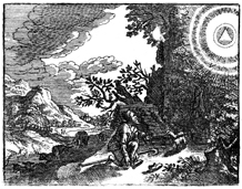 Description: Moses kneels before the burning bush and is called by God to lead Israel out of Egypt.