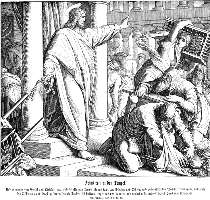 Description: Julius Schnorr von Carolsfeld's (1794-1872) depiction of Jesus overturning the tables of the moneychangers in the temple with a whip.