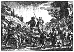 Description: Moses raises his staff to Heaven, and Manna falls to earth for the Hebrews to eat.