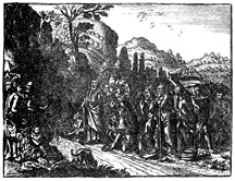 Description: Moses strikes the rock near Massah and Meribah with his staff, causing water to burst out to help the Hebrews survive.