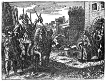 Description: Jephthah, having promised to sacrifice the first thing he sees upon returning home, sees his daughter and regrets his promise.
