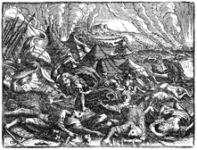 Description: Samson slays a thousand Philistines with the jawbone of an ass (foreground) and sets loose foxes with their tails on fire to burn the Philistine’s fields (background).