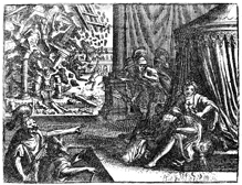 Description: Delilah delivers a sleeping Samson to the Philistine soldiers after cutting off his hair (foreground), but later Samson destroys the temple of Dagon with himself and many Philistines in it (background).