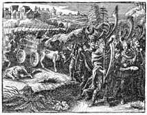 Description: As David brings the ark of God into Jerusalem on a cart driven by oxen, Uzzah touched the ark to steady it; as a result, the Lord struck down Uzzah, and David was angry and afraid to keep the ark.