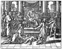Description: Solomon appears on his throne as two women approach, both claiming custody of a baby. Solomon's servant stands with drawn sword to divide the child between the two women.