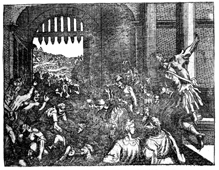 Description: A man is trampled upon the lifting of the siege of Samaria, as Elisha foretold.