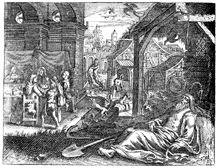 Description: Tobit buries a dead body (background); a sparrow defecates in Tobit's eyes, while he sleeps, causing him to go blind (foreground).