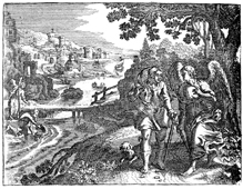 Description: Tobias is instructed to catch a fish in the river by his angel companion (right), and an angel instructs him to cut the liver, heart, and gall out of the fish and keep them (left).