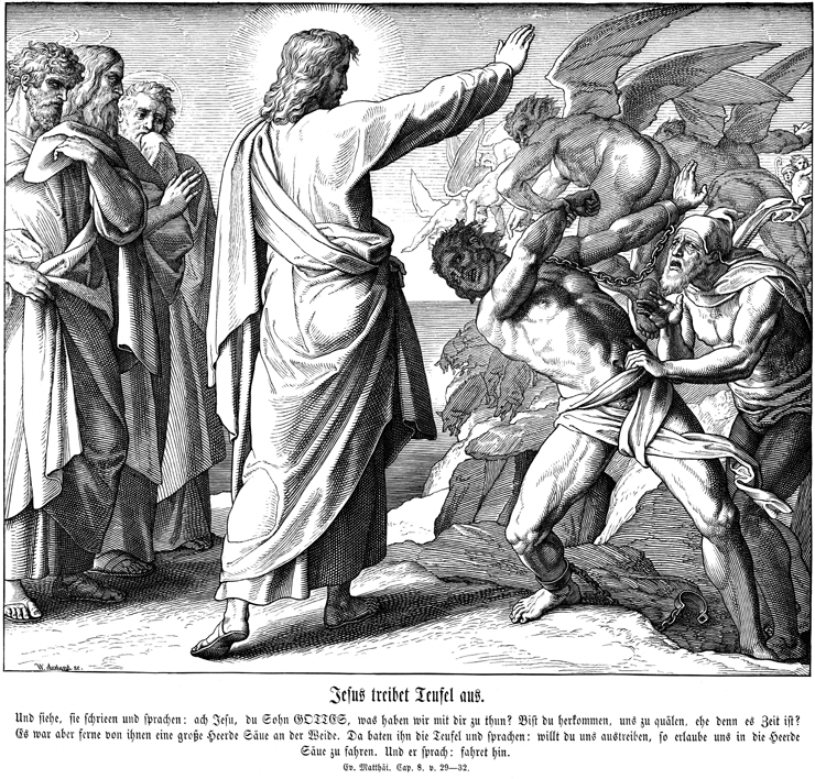 Description: Julius Schnorr von Carolsfeld's (1794-1872) depiction of Jesus casts out a legion of demons from two demoniacs in the Gadarenes; in the background the demons drive the pigs into the sea.