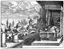 Description: As the four winds blow upon the waters, out of the sea emerge four beasts: one with the head of a lion and wings of the eagle; a second was in the form of a bear; the third beast with four heads and four wings; and the fourth beast had long teeth, multiple horns, and hooves like those of an ox. The image places these beasts on different continents to represent the four kings that will arise from the earth.