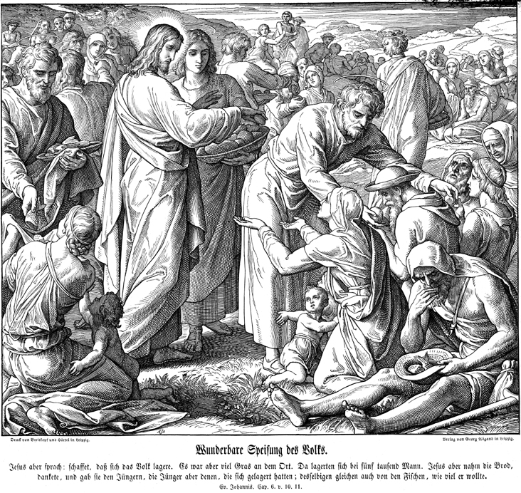 Description: Julius Schnorr von Carolsfeld's (1794-1872) depiction of Jesus feeding the 5000 with five loaves of bread and two fish.