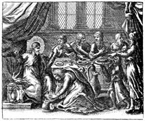 Description: An adulterous woman, identified as Mary Magdalene, dries Jesus' feet with her hair, as Jesus eats dinner with a group of Pharisees.