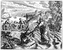 Description: Jesus rescues Peter from drowning after he begins to sink, due to the waves around him.